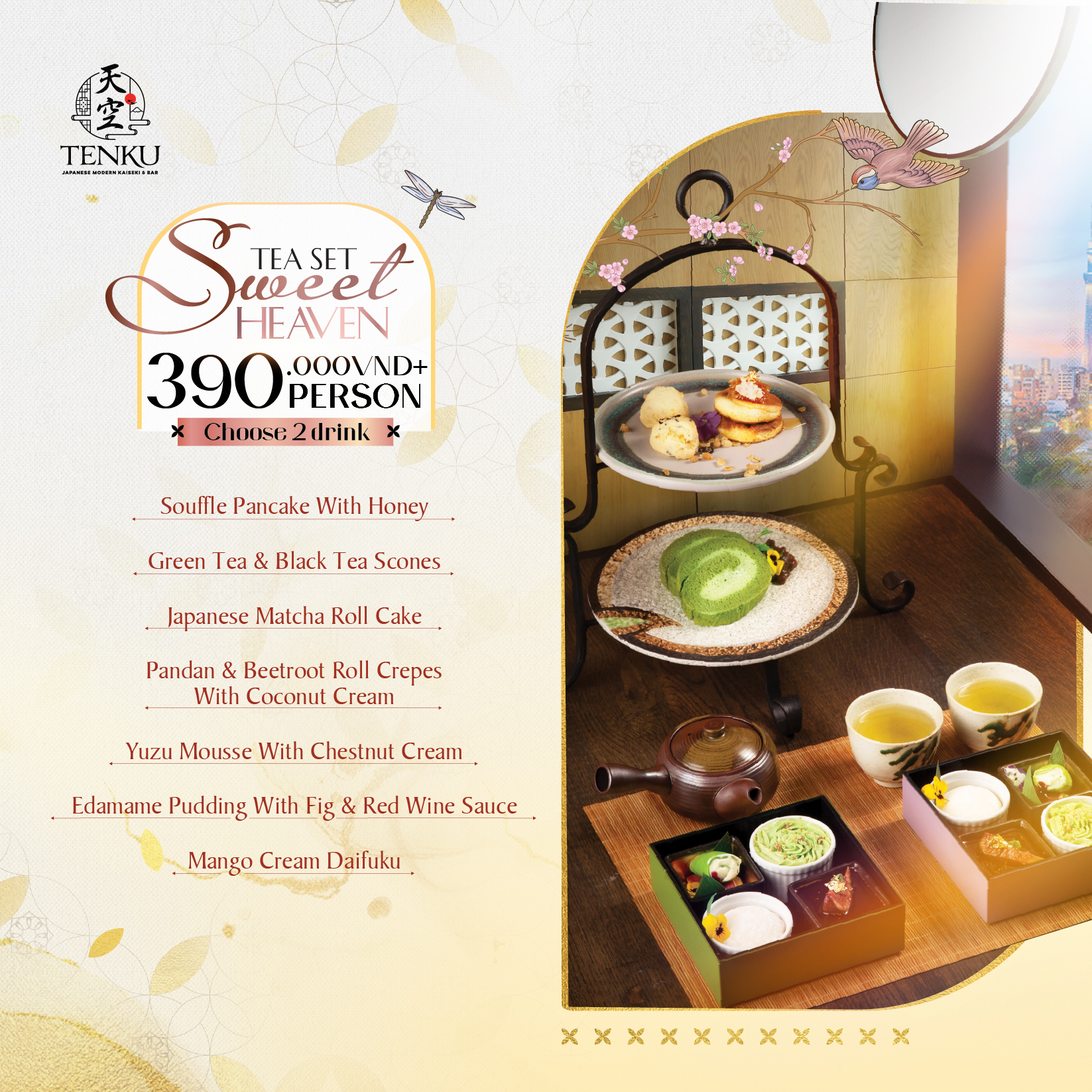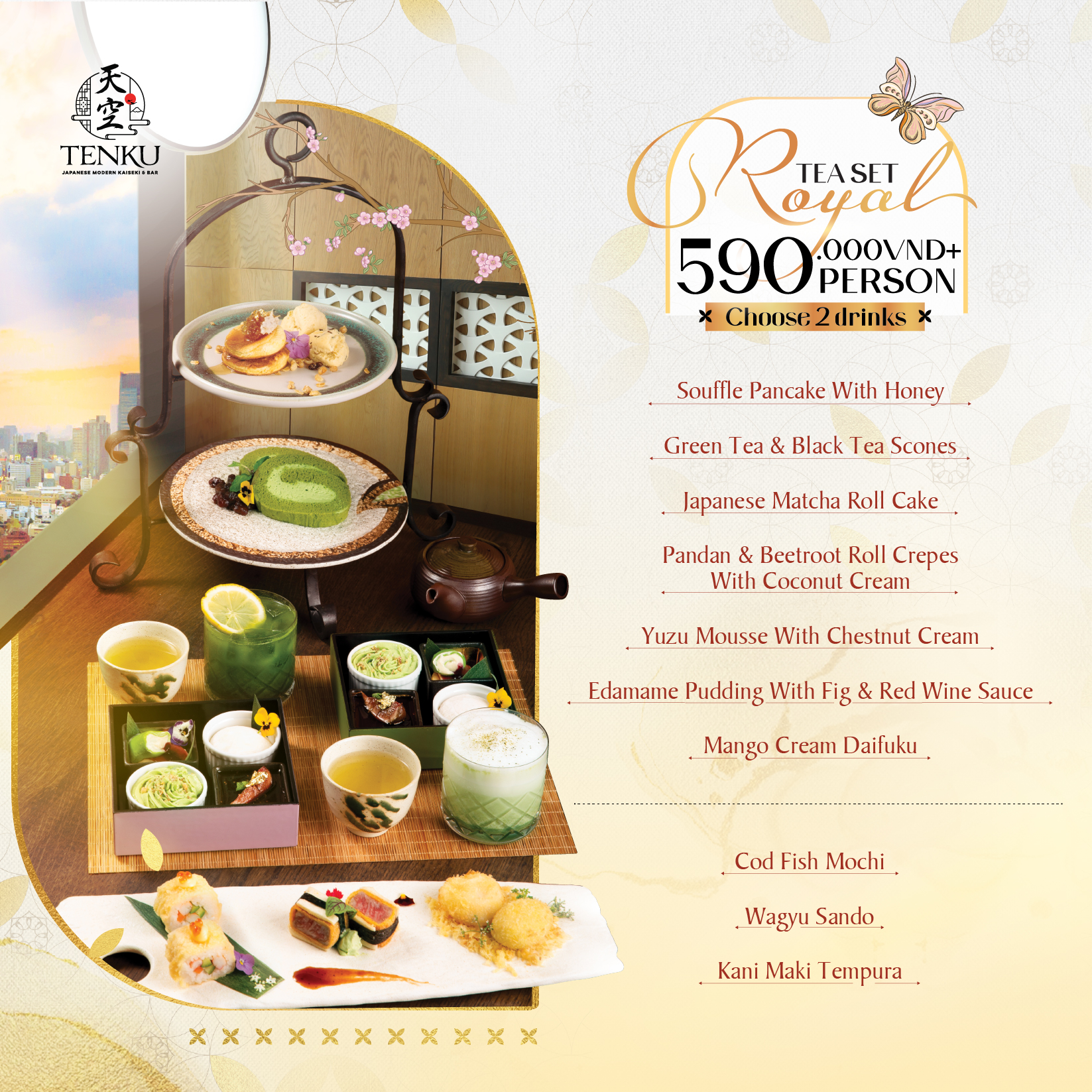 Tại Tenku, trà chiều không chỉ là một bữa thưởng thức, mà là một hành trình vị giác được dẫn dắt bởi tinh thần trà đạo Nhật Bản và sự thanh lịch giao thoa với phương Tây. Mỗi set trà được xây dựng như một câu chuyện, nơi bánh, trà và không gian cùng hòa quyện để tạo nên khoảnh khắc an yên trọn vẹn.