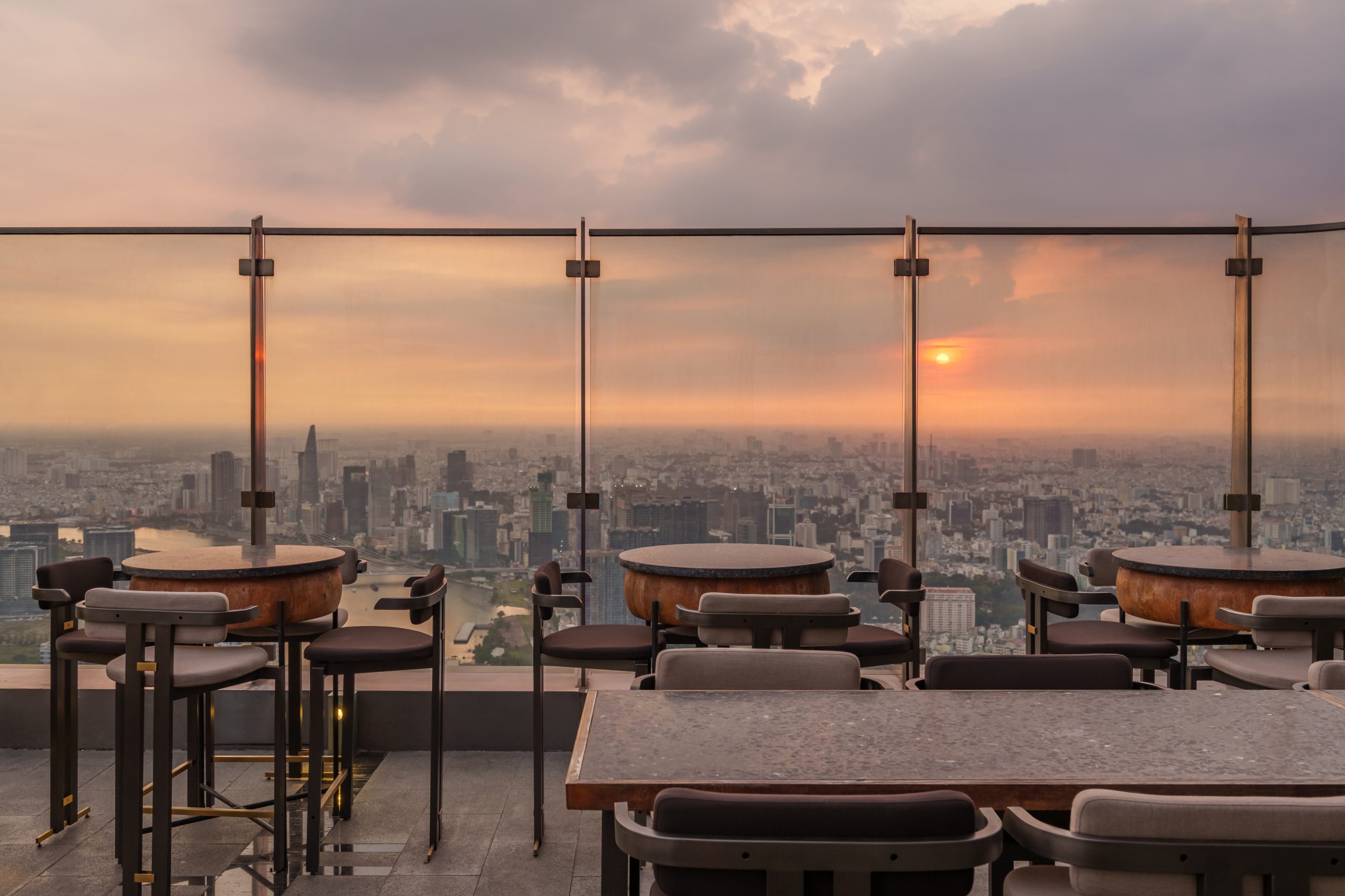 Không chỉ dừng lại ở nội thất, điểm nhấn đặc biệt của Sky Bar chính là tầm nhìn “triệu đô”. Từ đây, khách có thể ngắm trọn vẹn khung cảnh sông Sài Gòn thơ mộng, ánh hoàng hôn nhuộm màu cam một khoảng trời hay ánh đèn rực rỡ về đêm. Mỗi thời khắc đều mang một vẻ đẹp riêng, biến nơi đây thành không gian sống ảo lý tưởng cho giới trẻ và du khách quốc tế.