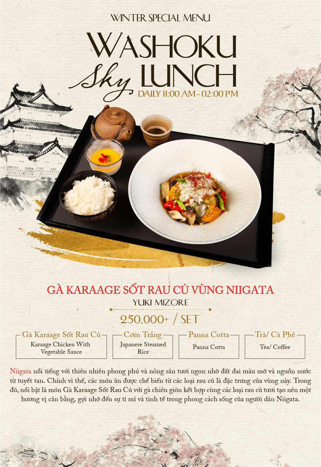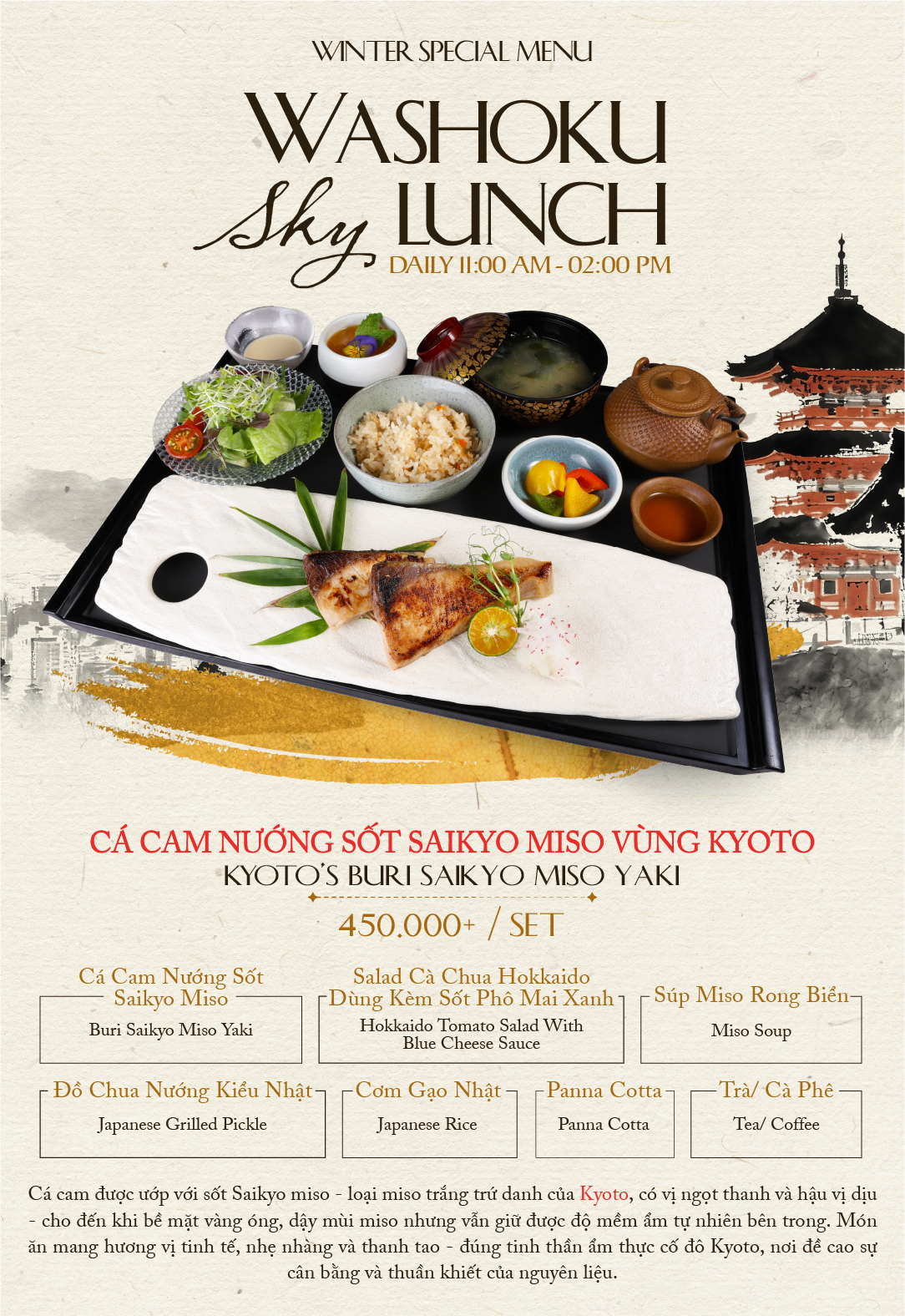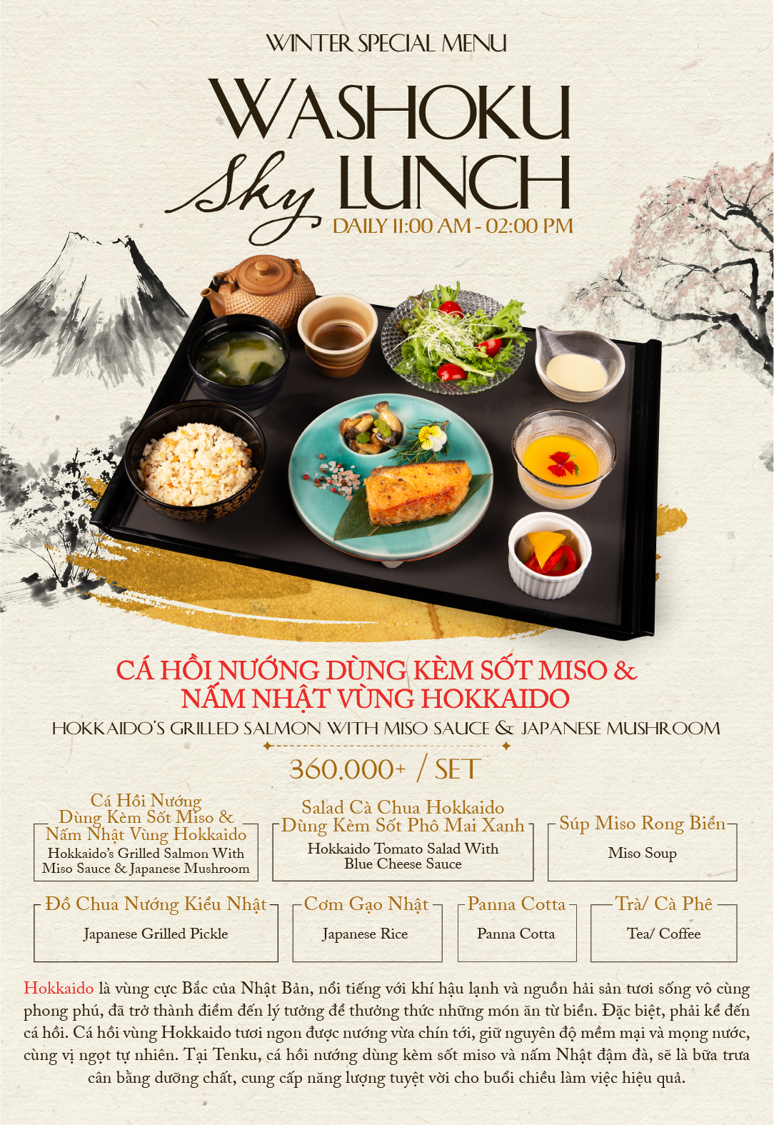 Washoku Sky Lunch được phục vụ trong khung giờ 11h – 14h hằng ngày (trừ ngày Lễ, Tết) mang đến trải nghiệm trọn vẹn, mỗi set bao gồm: món chính, món phụ, tráng miệng và thức uống. Set menu được thiết kế tinh tế và cân bằng cả về định lượng và dinh dưỡng, giúp thực khách có một bữa trưa đầy ấn tượng và nạp đủ năng lượng cho một buổi chiều làm việc hiệu quả.