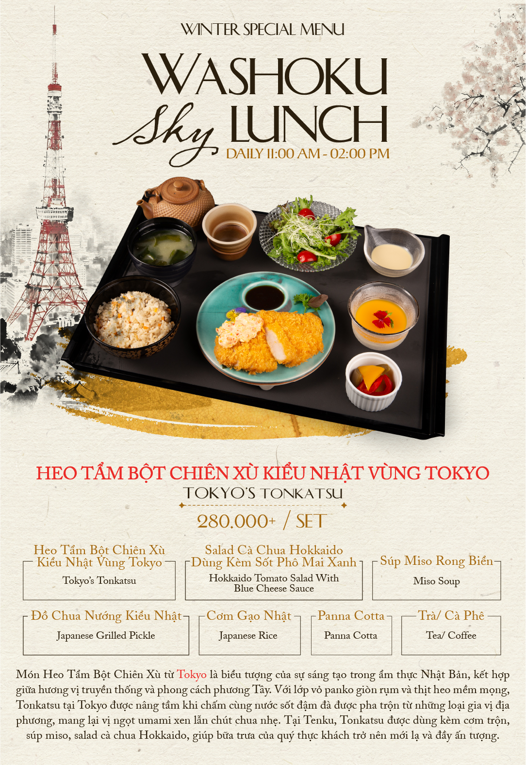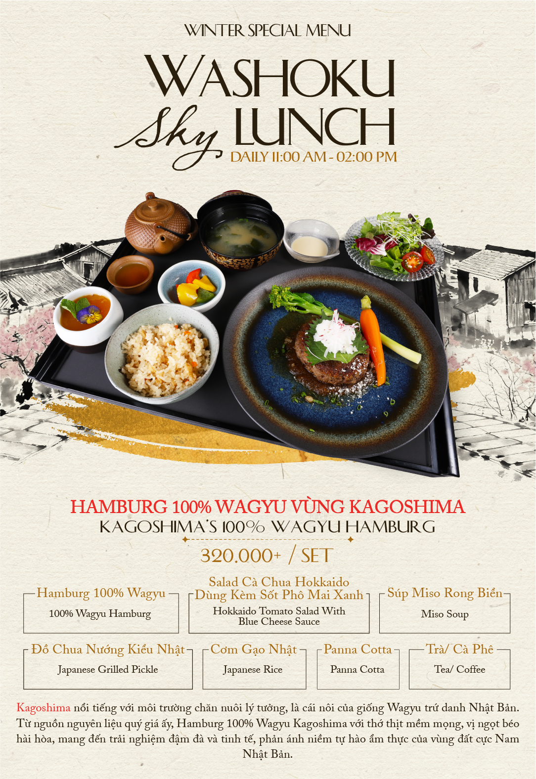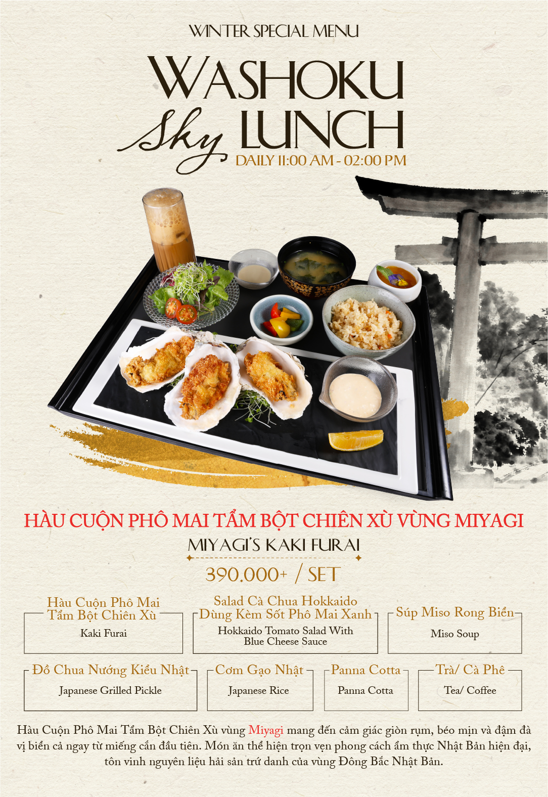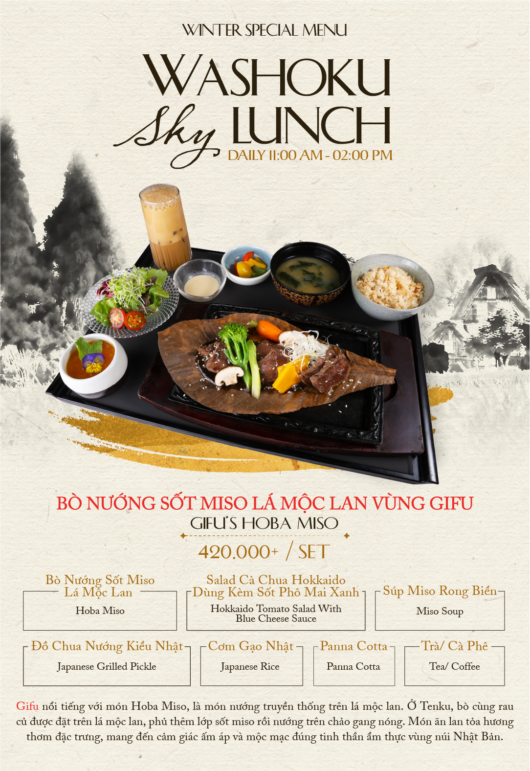 Washoku Sky Lunch được phục vụ trong khung giờ 11h – 14h hằng ngày (trừ ngày Lễ, Tết) mang đến trải nghiệm trọn vẹn, mỗi set bao gồm: món chính, món phụ, tráng miệng và thức uống. Set menu được thiết kế tinh tế và cân bằng cả về định lượng và dinh dưỡng, giúp thực khách có một bữa trưa đầy ấn tượng và nạp đủ năng lượng cho một buổi chiều làm việc hiệu quả.